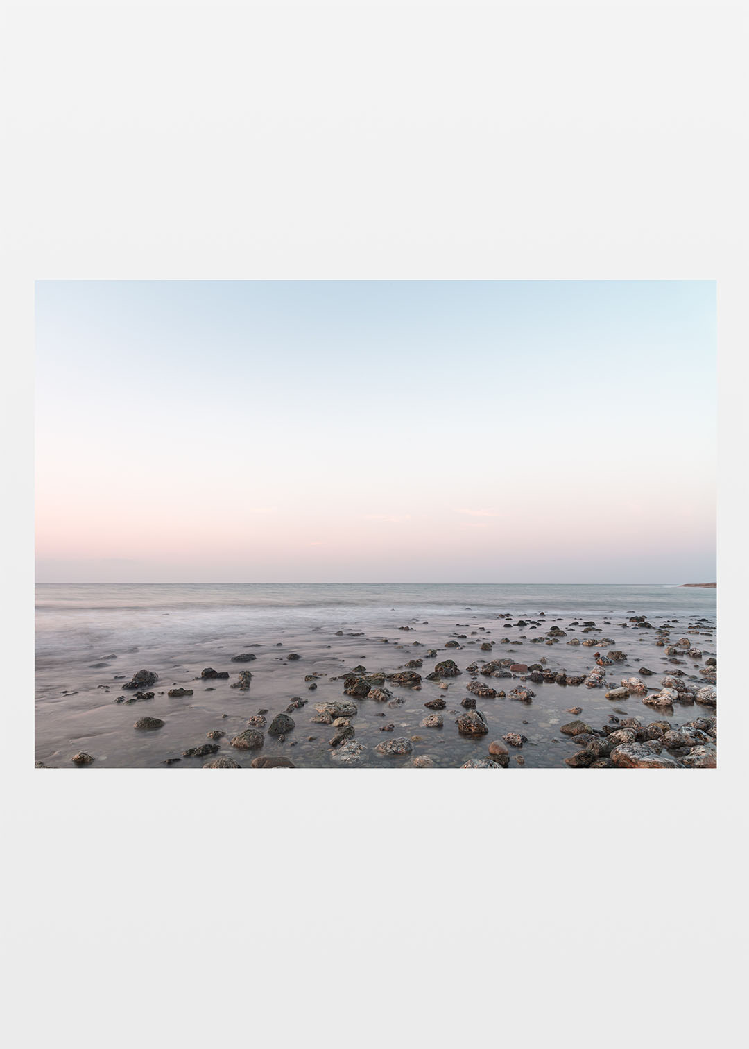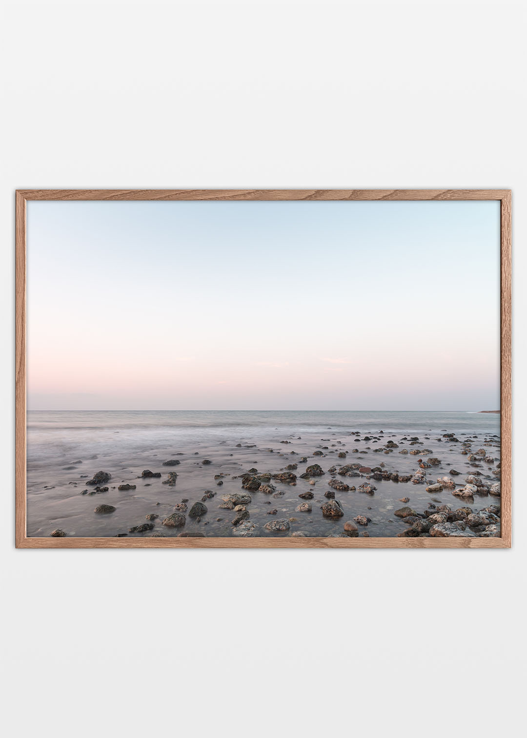 Blå aftenlys plakat indfanger den stille aftenstemning ved Klitmøller, hvor himlens kølige blå toner spejler sig i havets overflade og skaber en harmonisk forbindelse med kystens stenede landskab. Solnedgangens dæmpede farver understreger naturens enkelhed og rå skønhed, hvilket giver plakaten et minimalistisk og nordisk udtryk. Denne plakat bringer en følelse af ro og balance ind i hjemmet og passer perfekt til en indretning, der hylder naturlige elementer og afdæmpede farver.