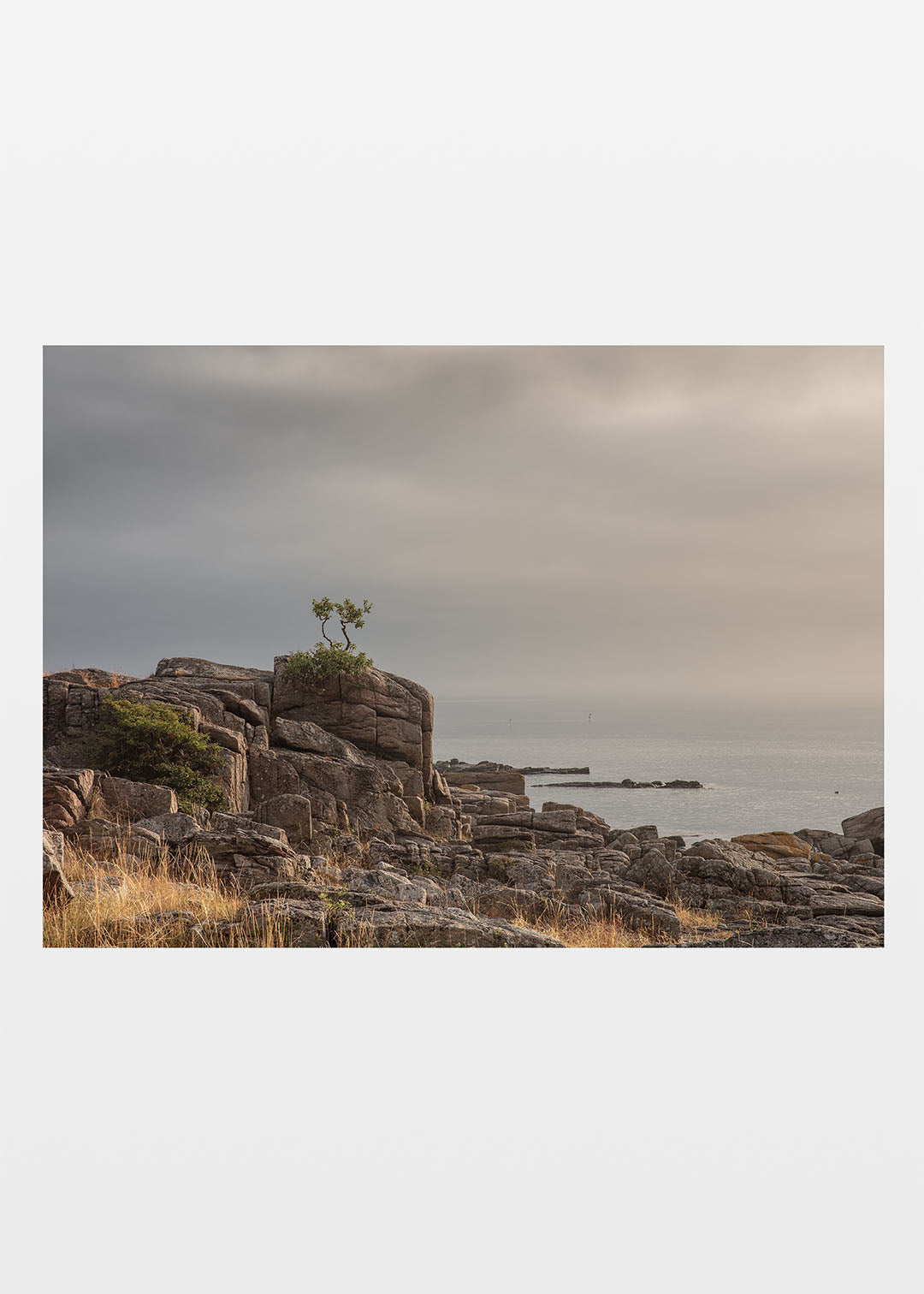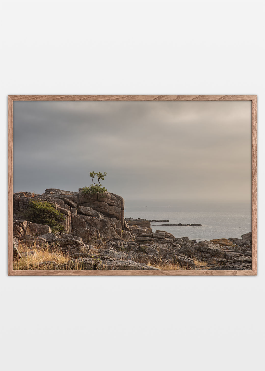 Plakaten viser et fascinerende bonsai-lignende træ, der gror på de barske klipper langs Bornholms nordkyst. Dette unikke motiv, nu i vandret format, fanger øjeblikket, hvor naturens styrke og skønhed mødes i en fortryllende symbiose.