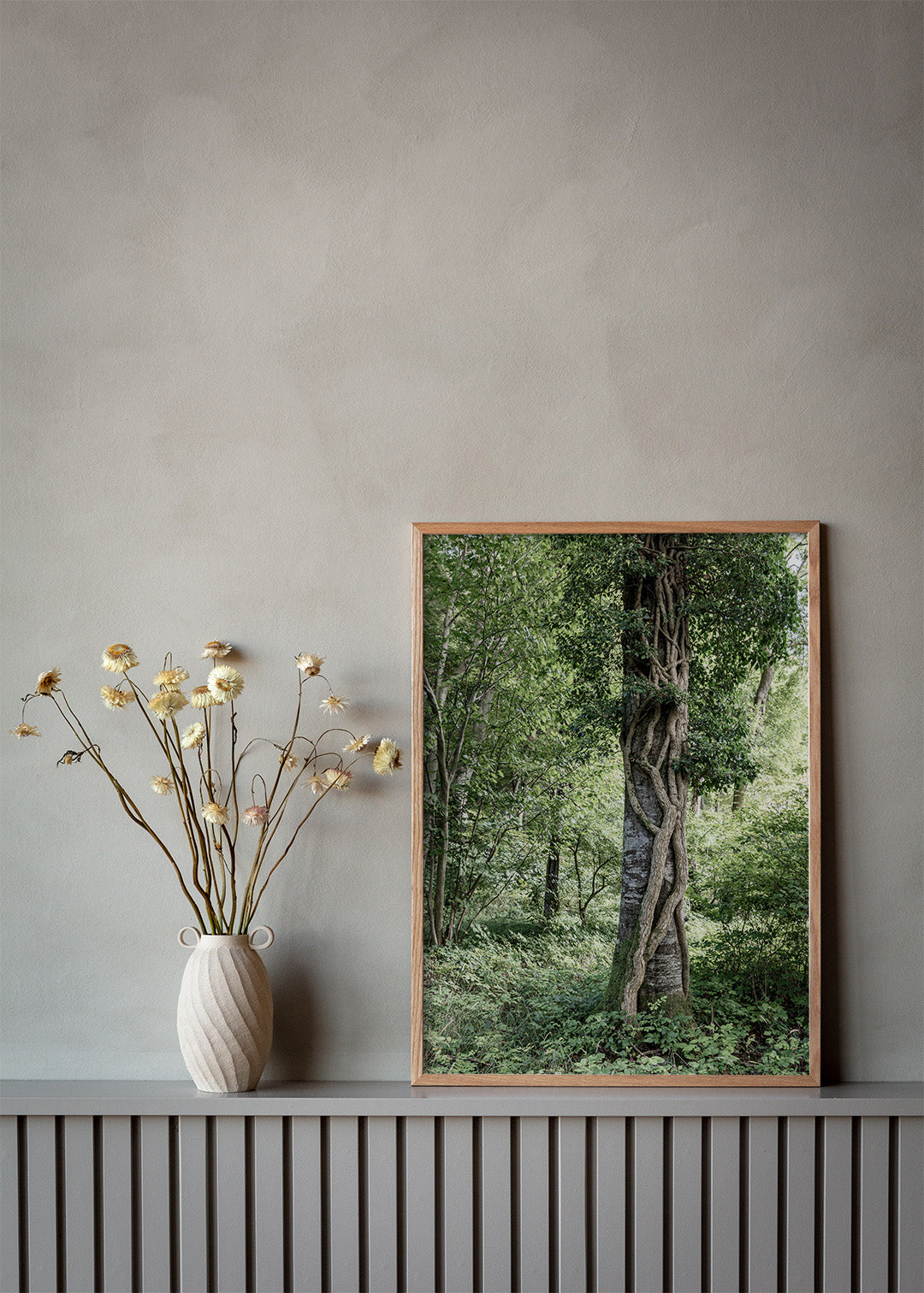Fotografiet til denne Fredskov plakat viser et træ, hvor en tyk vedbend slynger sig op ad stammen og giver en følelse af naturens kraft og sammenhæng. Billedet er taget i september, lige inden efteråret sætter ind og giver skoven et særligt skær. Den varme efterårssol fremhæver bladene og skaber en smuk kontrast til vedbendens mørkegrønne blade.