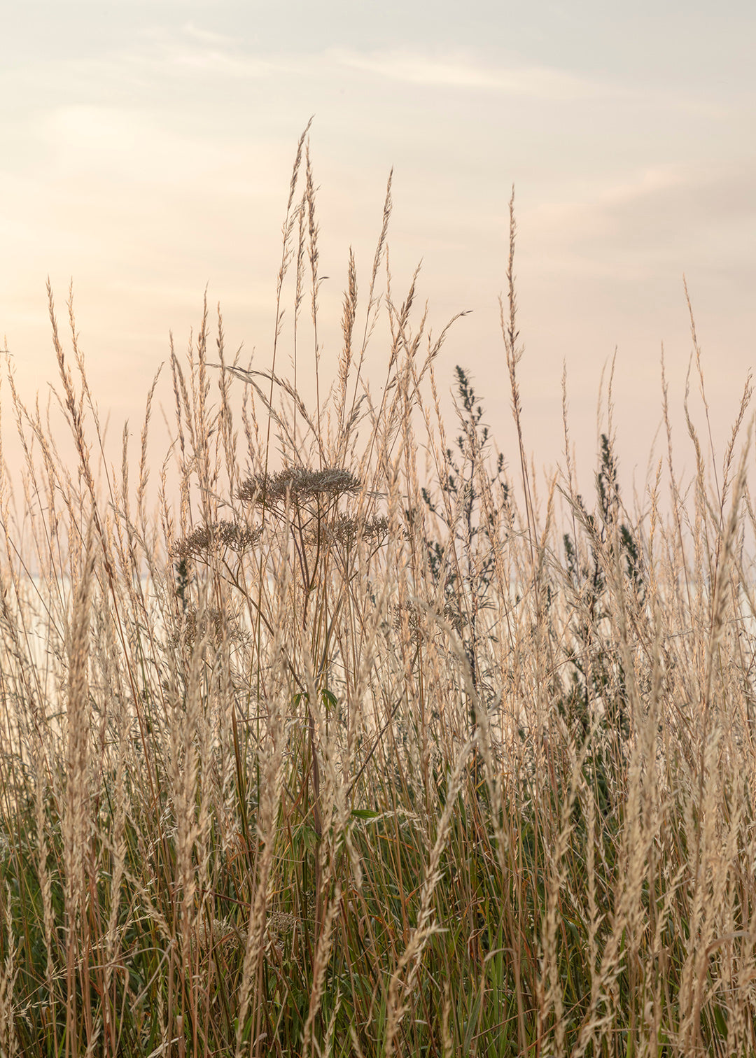 Stemningsfuld plakat med gyldent græs ved kysten på Gotland, Sverige. Fotografi med fokus på naturens enkle detaljer og bløde farver, der skaber en rolig og harmonisk atmosfære.