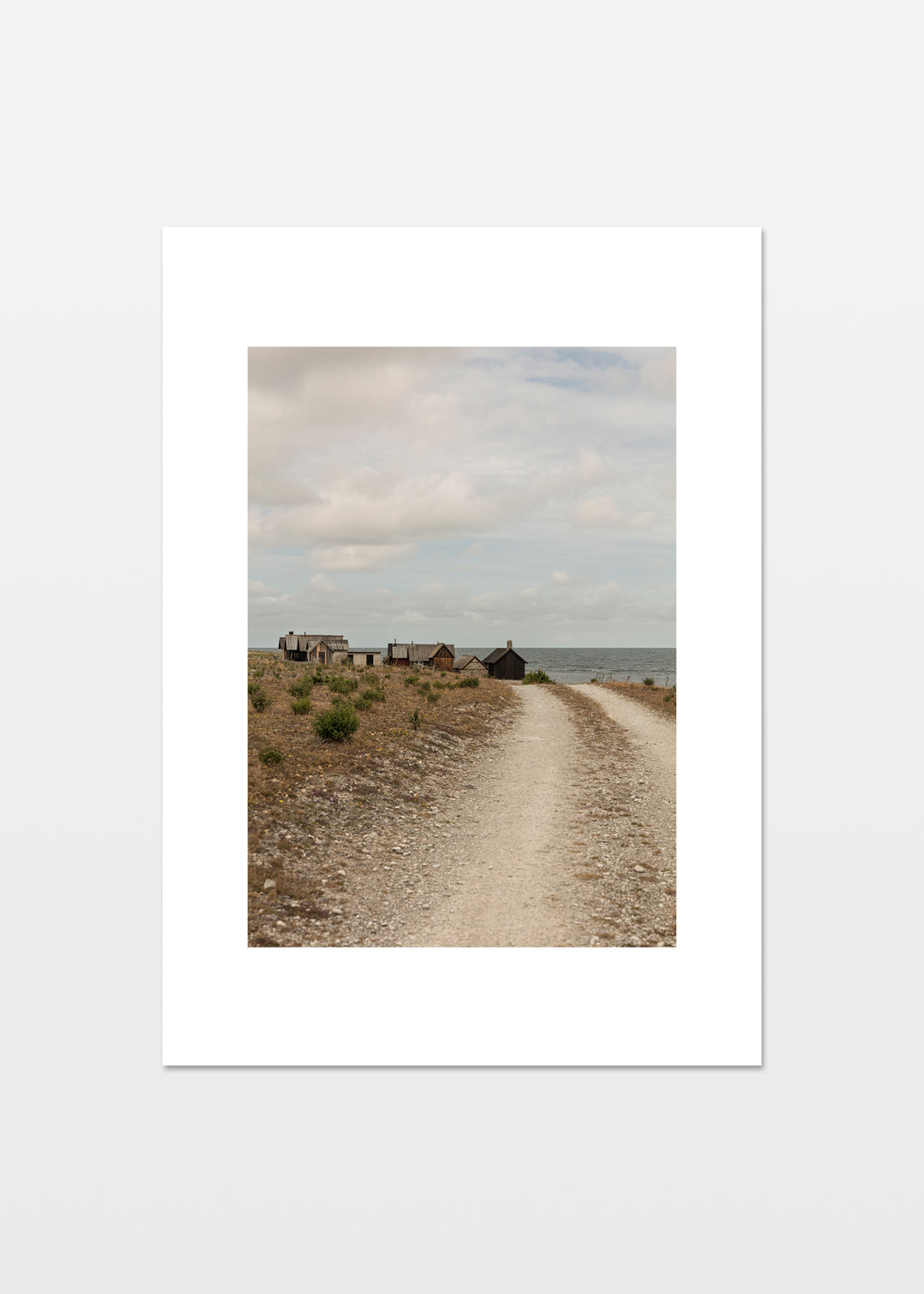 Helgumannen fiskeläge på Fårö er kendt for sine velbevarede fiskerhytter, der ligger langs den stenede kyst med udsigt over Østersøen. Denne plakat i lodret format indfanger en rolig stemning, hvor stien fører beskueren ned til klyngen af hytter, omgivet af tørt kystlandskab og bløde skyer på himlen.