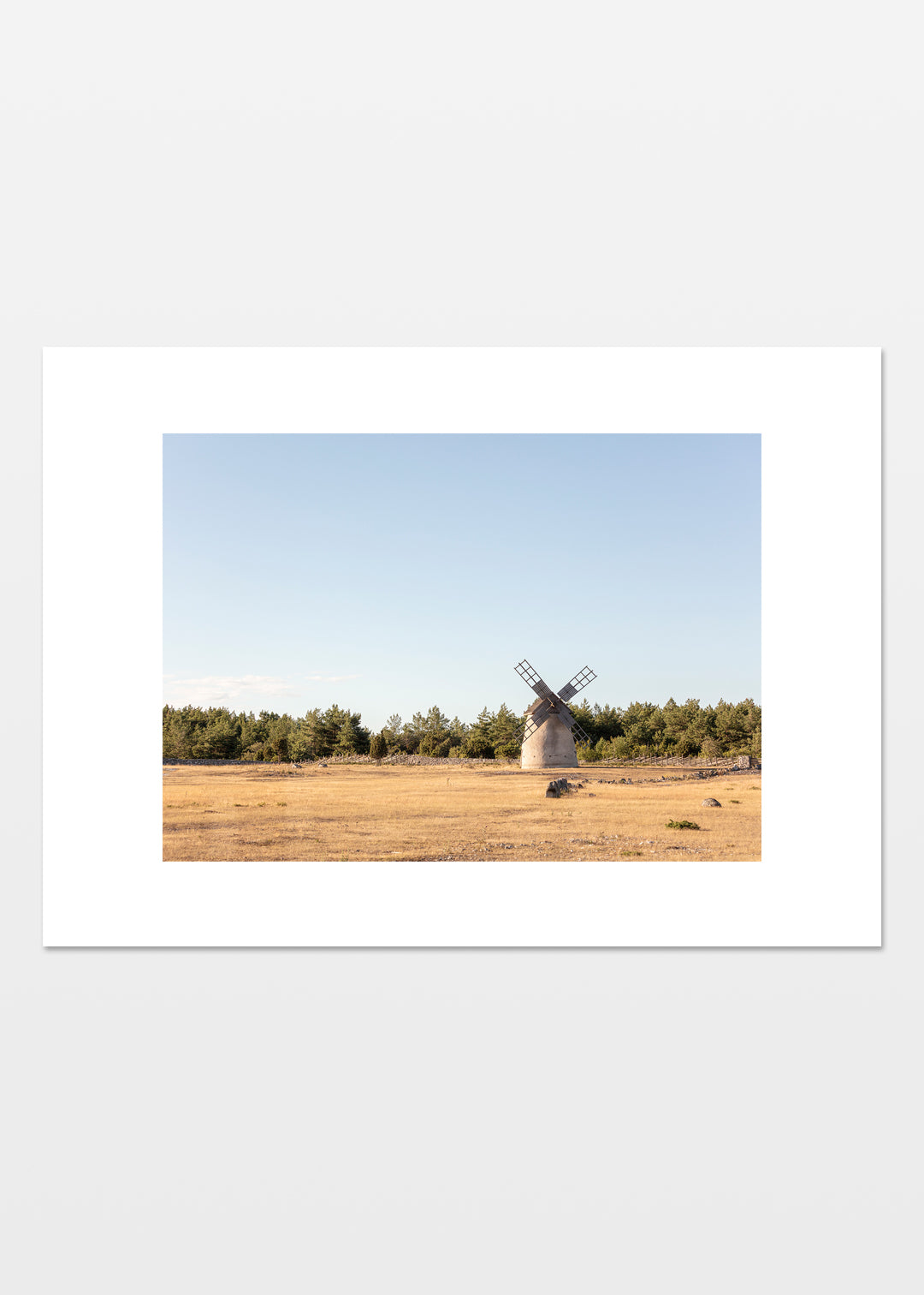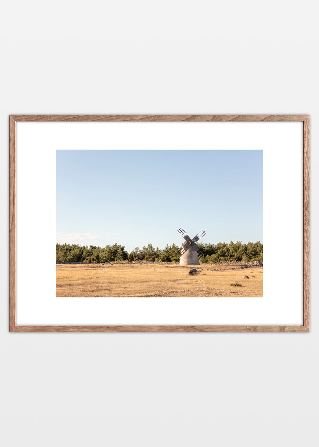 Plakat med motiv af en klassisk vindmølle på Gotland, stående midt i et åbent landskab med gyldne marker under en klar blå himmel. Billedet indfanger den varme sommerstemning og møllens historiske karakter.