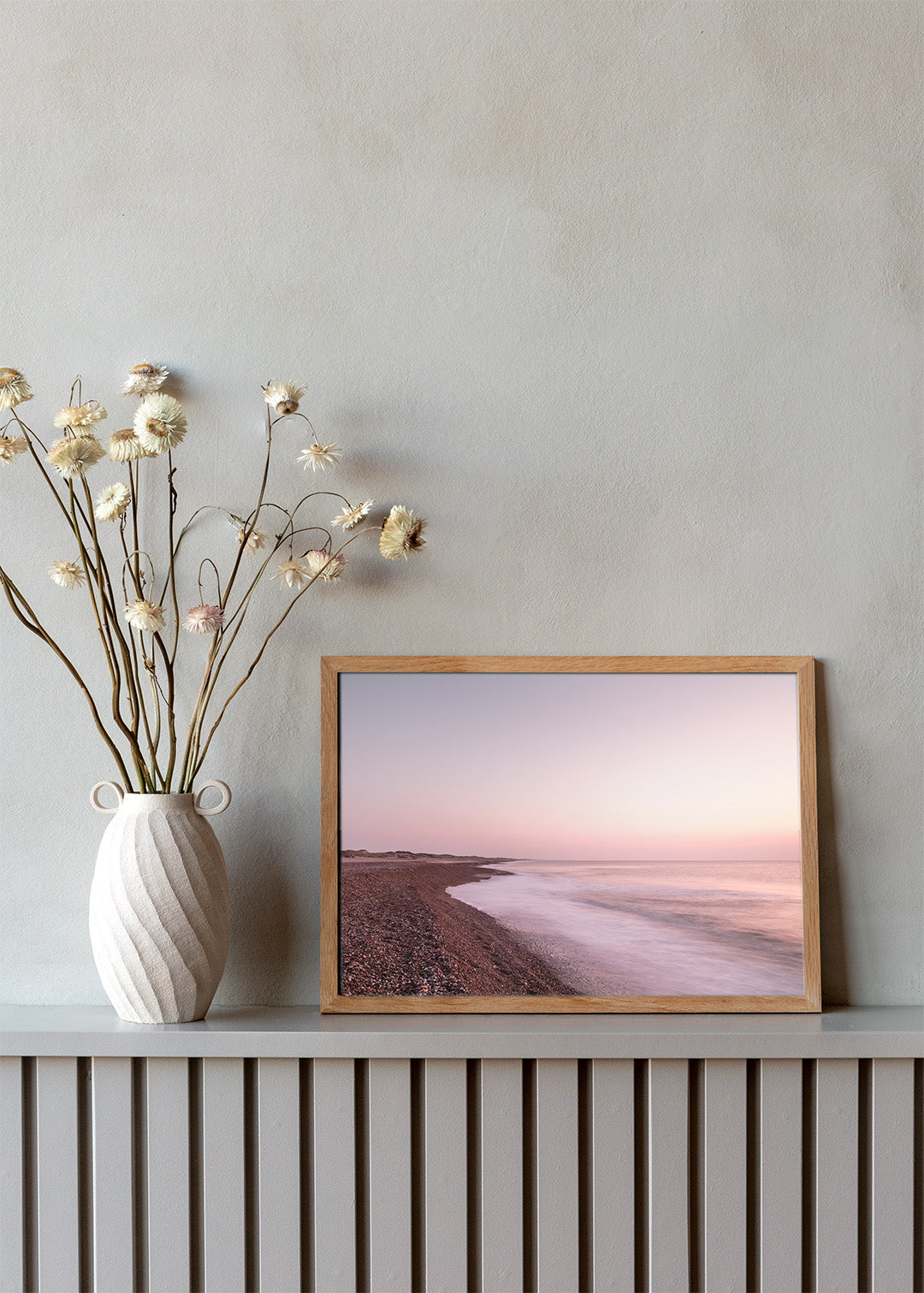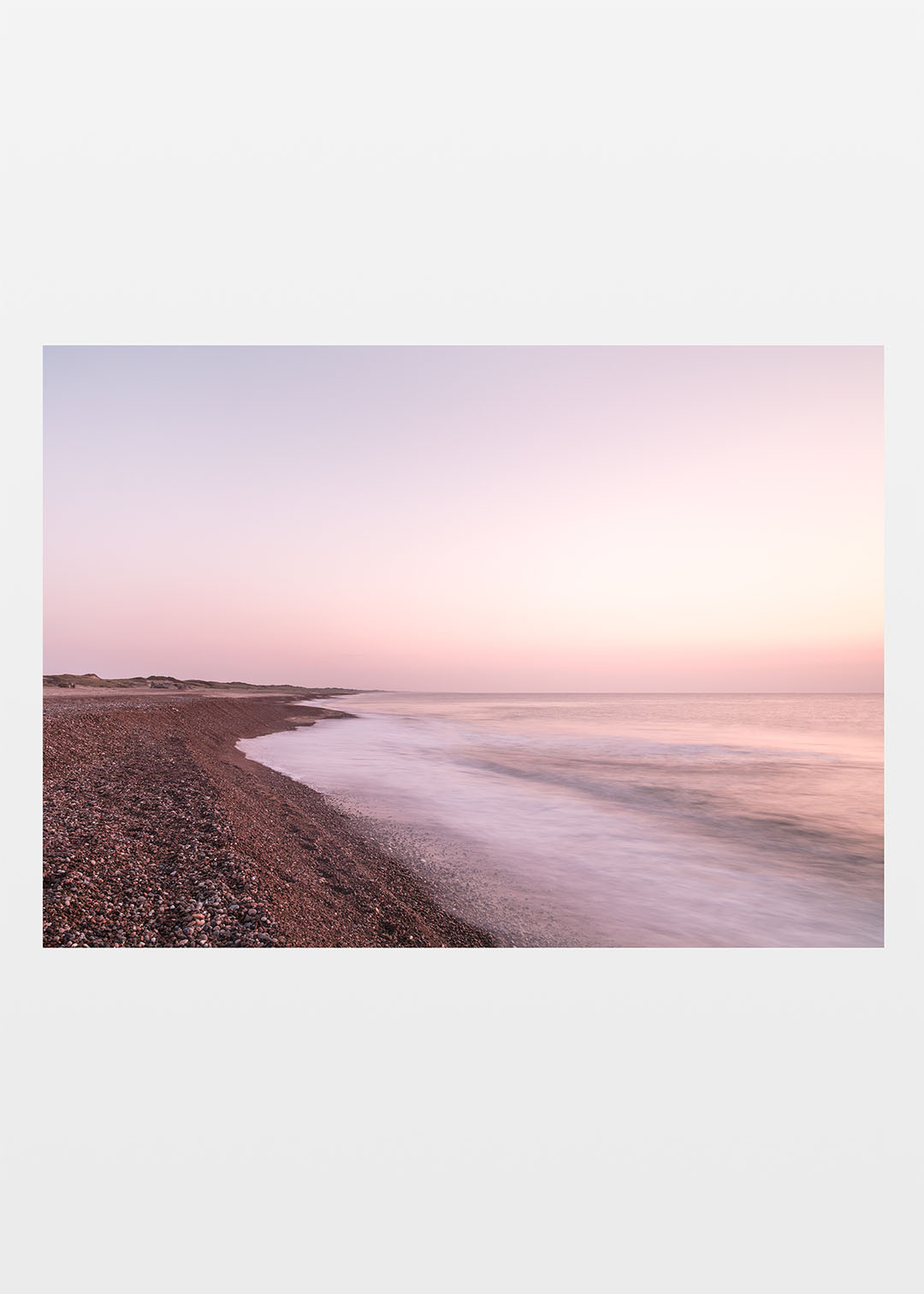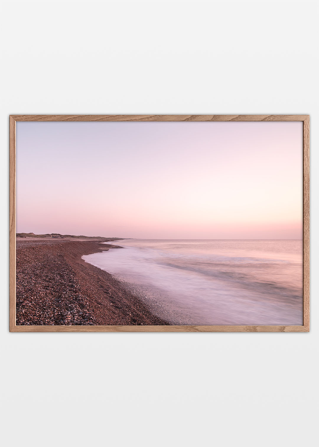 Rosa aftenlys plakat indfanger den rolige skønhed ved Klitmøller, hvor aftenhimlen lyser op i rosa toner og kaster et blidt skær over kysten. Fotografiet viser vestkystens rå og uforstyrrede landskab, når dagen går på hæld, og bølgerne ruller stille ind mod stranden. Dette motiv bringer naturens fredfyldte skønhed og nordiske enkelhed ind i hjemmet.
