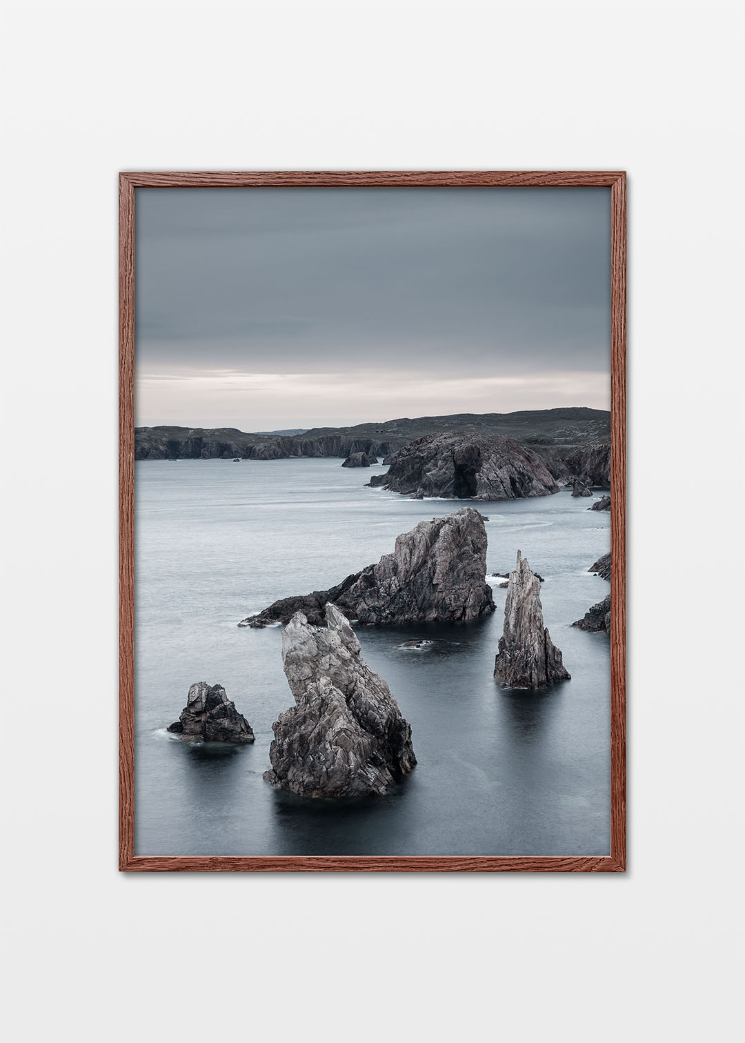 Ydre Hebrider plakat af de dramatiske Mangursta Needles i Skotland. Solen er gået ned, og bugten er indhyllet i et smukt blåt lys, hvor aften og nat mødes. Mangursta ligger fjernt fra civilisationen, og denne majestætiske klippekyst besøges kun af få. Det barske landskab og det hårde klima fik beboerne i det nærliggende samfund til at forlade området for mange år siden. Plakaten indfanger den rå og uberørte skønhed ved denne afsidesliggende kyststrækning, hvor naturens kræfter hersker. Plakaten er printet på høj kvalitets papir med en professionel fotoprinter, hvilket sikrer, at alle detaljer og nuancer i landskabet bliver levende gengivet. Dette gør plakaten ideel for dem, der ønsker at bringe et stykke af Skotlands vilde og dramatiske kystnatur ind i deres hjem.